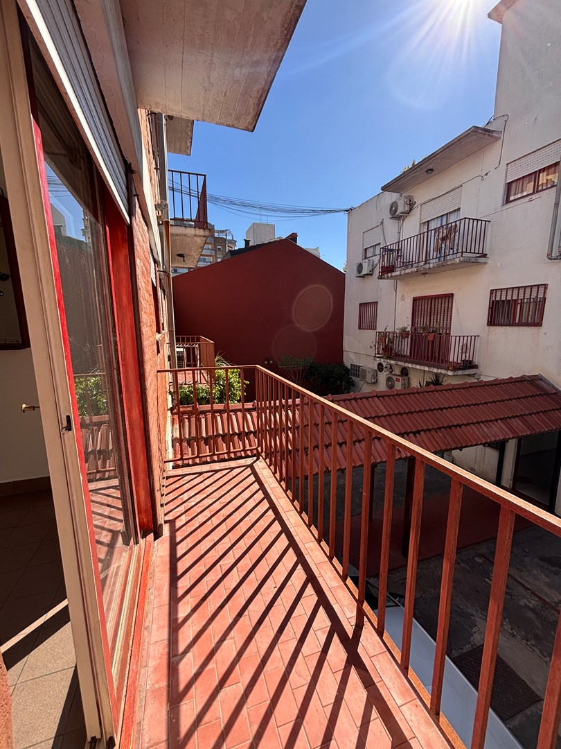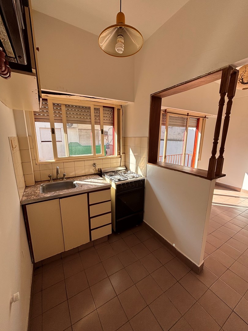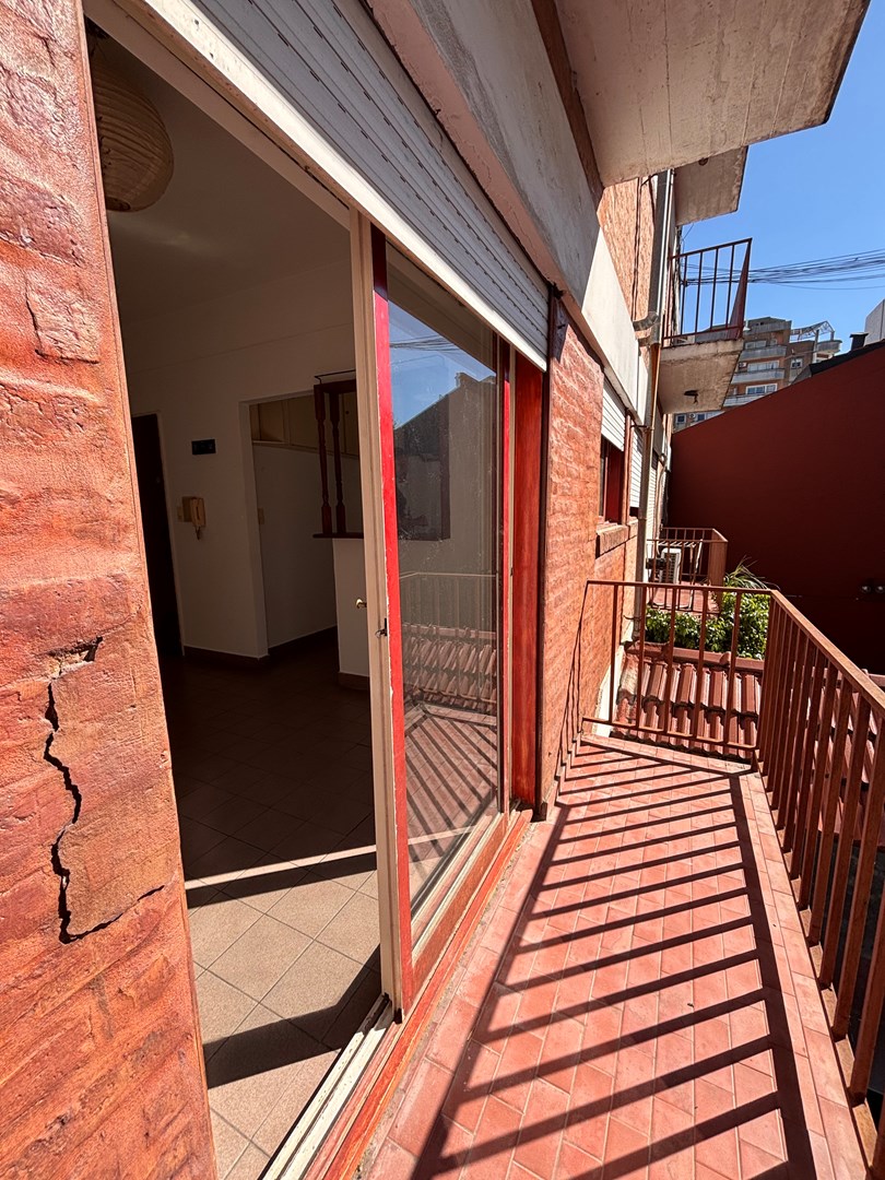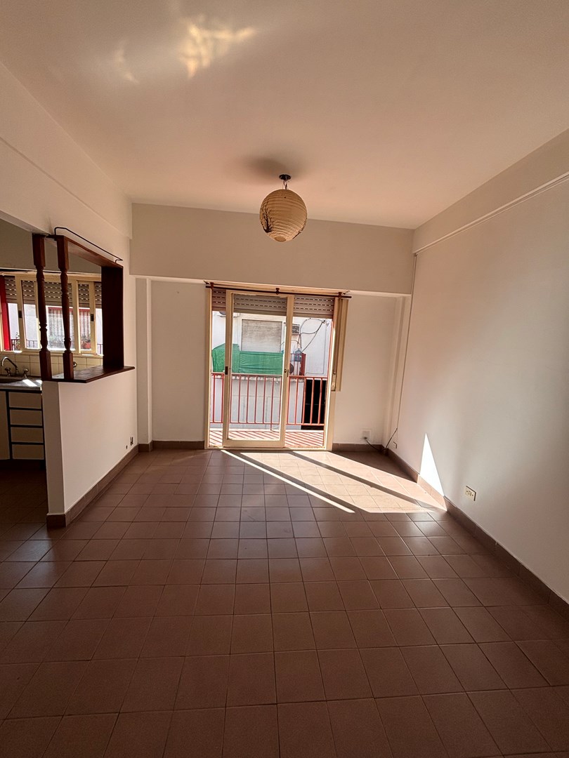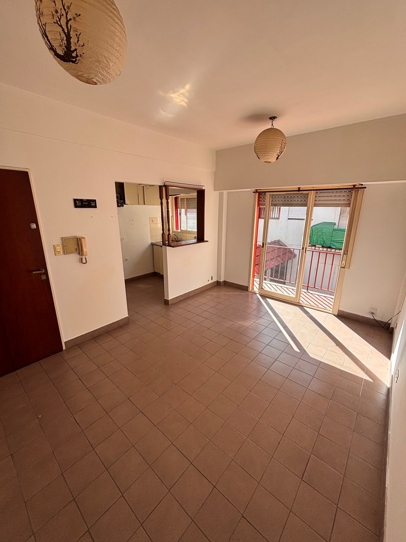 Luminoso departamento 2 ambientes con espacio guarda cochera. Se encuentra situado en primer piso por escalera, cocina semi integrada, salida hacia su balcón, habitación con placard empotrado y guardacoche descubierto en PB.